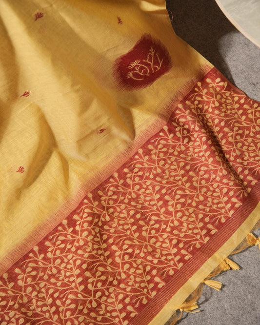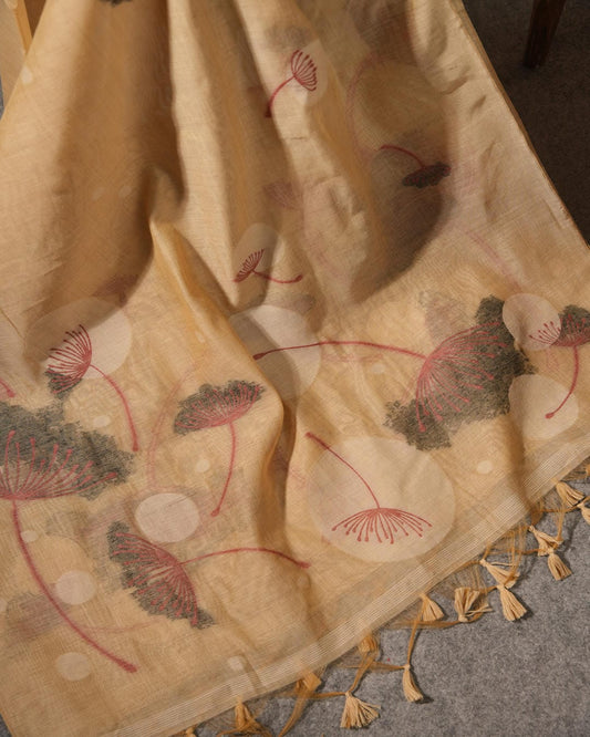 Golden Sand Muga Cotton Hand-Woven Unstitched Suit Set with Botanical Motifs