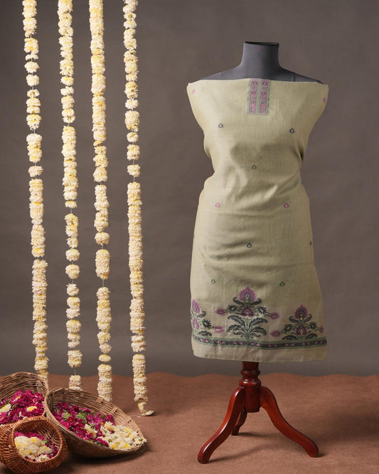 Ivory Nectar Muga Cotton Unstitched Suit Set with Traditional Floral Embroidery