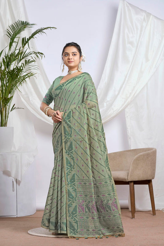 Dusty Sage Green Jamdani Soft Cotton Saree – Woven Design and Jamdani Border