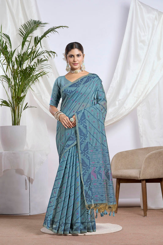 Dusty Blue Jamdani Muga Cotton Saree | Geometric Woven Motifs and Jamdani Border