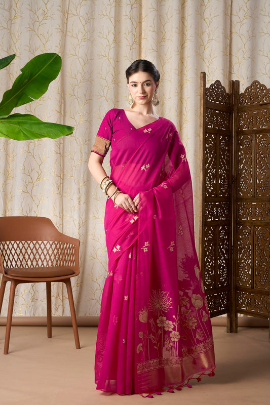 Rani Pink Muga-Cotton Jamdani Saree with Golden Zari Motifs