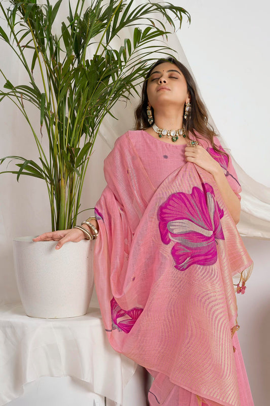 Dusty Rose Zari Jamdani Soft Cotton Saree – Woven Floral Design