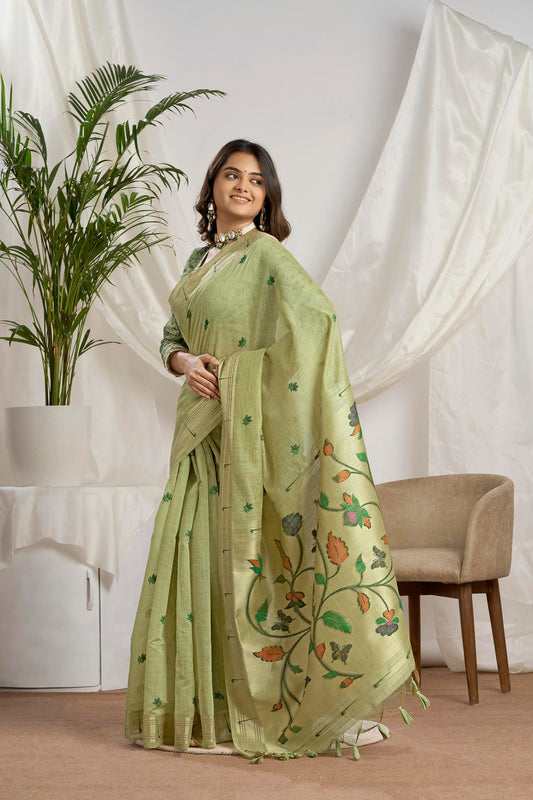 Pastel Green Linen-Cotton Jamdani Saree with Ethnic Motifs