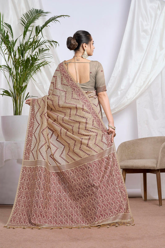 Beige Linen-Cotton Jamdani Saree with Ethnic Motifs