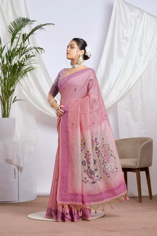 Dusty Rose Linen-Cotton Jamdani Saree with Ethnic Motifs