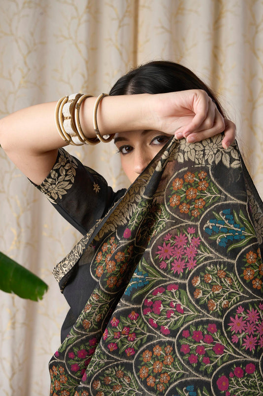 Midnight Black Jamdani Saree with Multicolor Floral Border