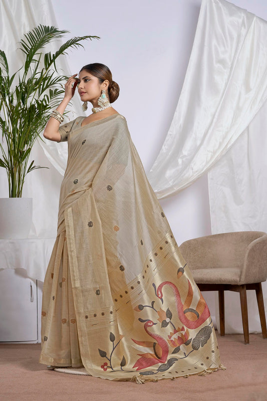 Sand Beige Muga-Cotton Saree | Zari Jamdani Bird Motifs and Jari Border