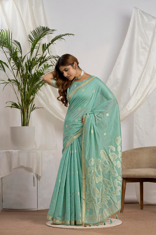 Sea Green Zari Jamdani Saree with Woven Foliage Jari Border,fancy Pallu Design