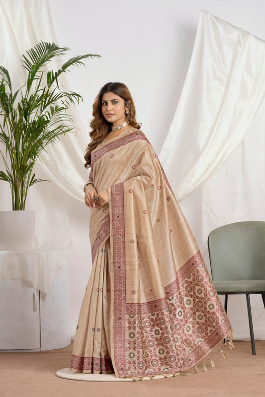 Dhakai Tassar Silk Saree in Beige with Woven Mirror Work
