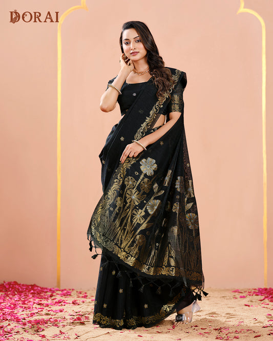 Mystic Black Zari Jamdani Saree | Handloom Jute Linen-Cotton Weave