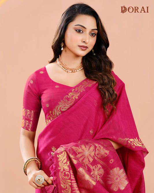 Solid Pink Zari Jamdani Saree | Handloom Jute Linen-Cotton Weave