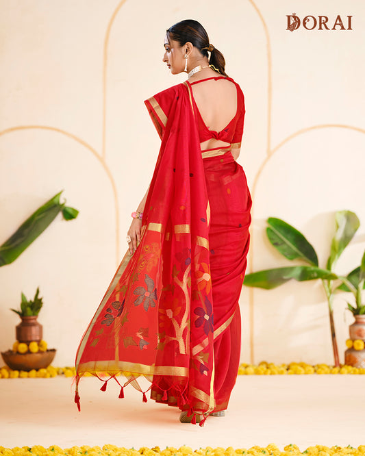 Deep Scarlet Zari Jamdani Muga Cotton Saree | Floral Woven Oragana Pallu