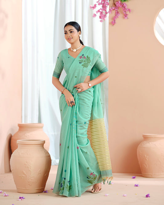 Mint Green Muga Cotton Jamdani Saree – Woven Floral Pattern and Oragana Pallu