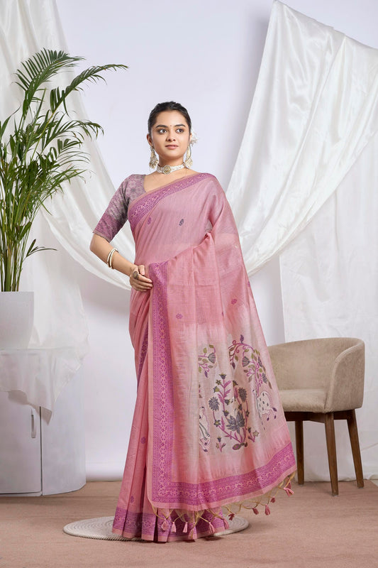 Old Rose Muga-Cotton Saree | Paithani Jari Jamdani Peacock Motif