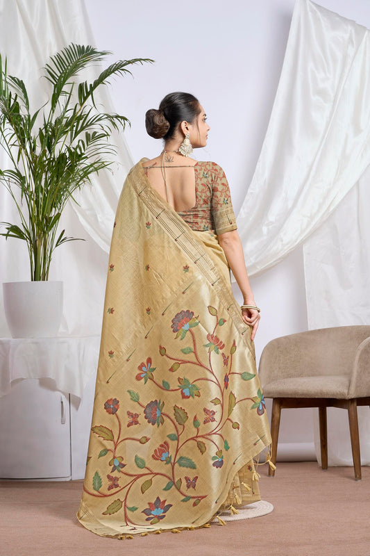 Pale Golden Beige Linen-Cotton Jamdani Saree | Paithani Inspired Artistic Woven Pallu