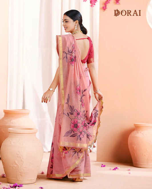 Rosy Sheen – Pink Muga Tissue Cotton Saree with Nature Artistry