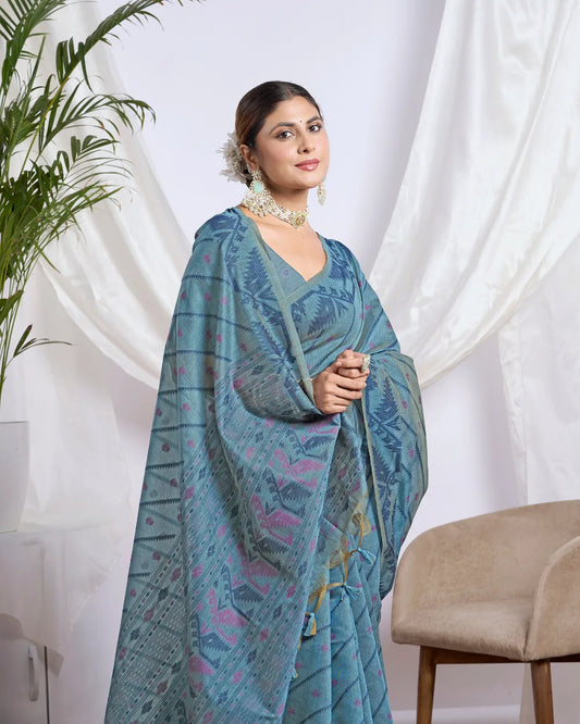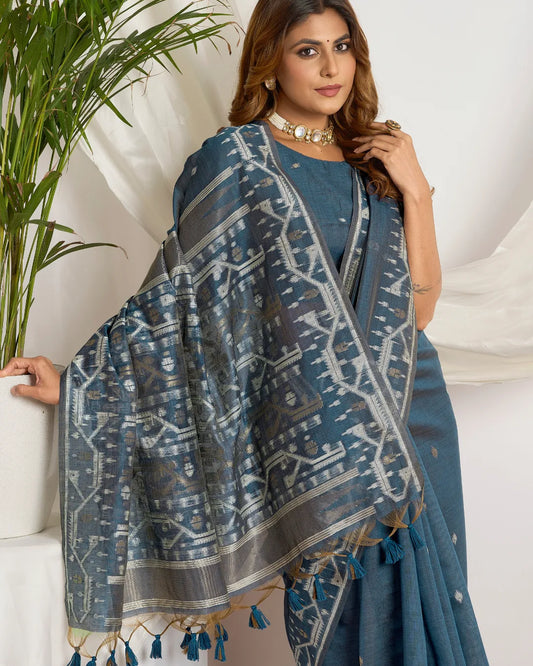 Slate Elegance – Dusty Blue Muga Cotton Saree with Tribal Weave
