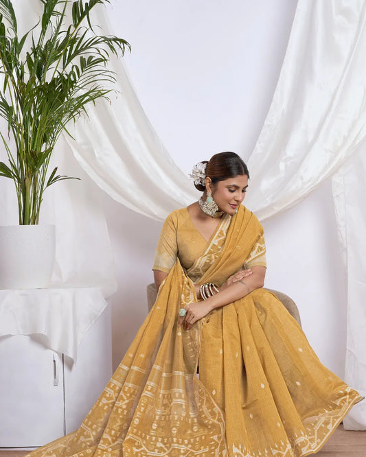 Golden Earth – Mustard Yellow Muga Cotton Saree with Rustic Art