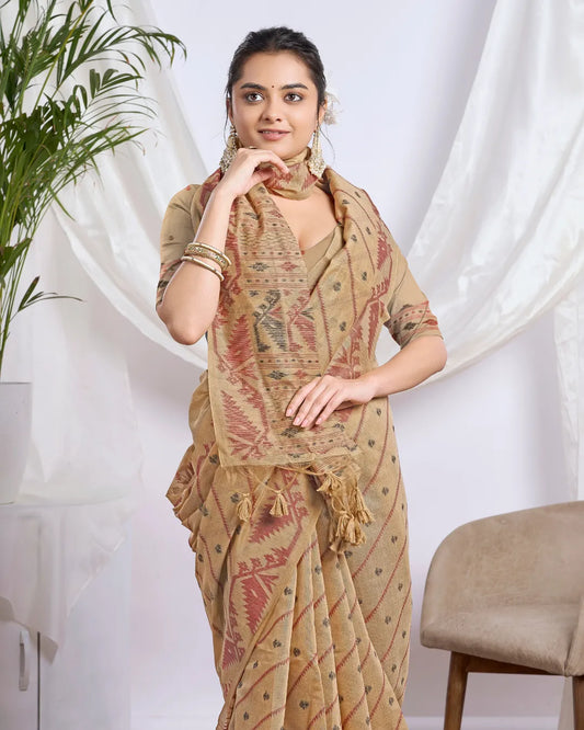 Olive Grace – Pista Green Muga Cotton Saree with Tribal Patterns