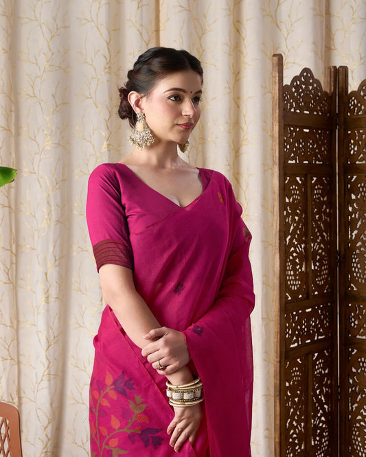 Rani Pink Jamdani Muga Cotton Saree with Traditional Resham Border