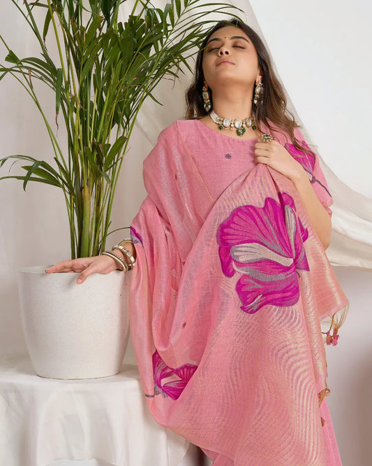 Blush Bloom – Pink Muga Cotton Saree with Botanical Artistry