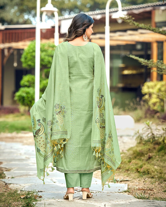 Jade Serenity – Pista Green Muga Cotton Suit with Peacock Elegance