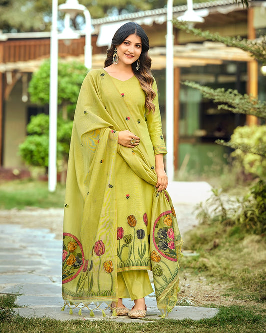 Emerald Heritage – Pista Green Muga Cotton Suit with Peacock Grace
