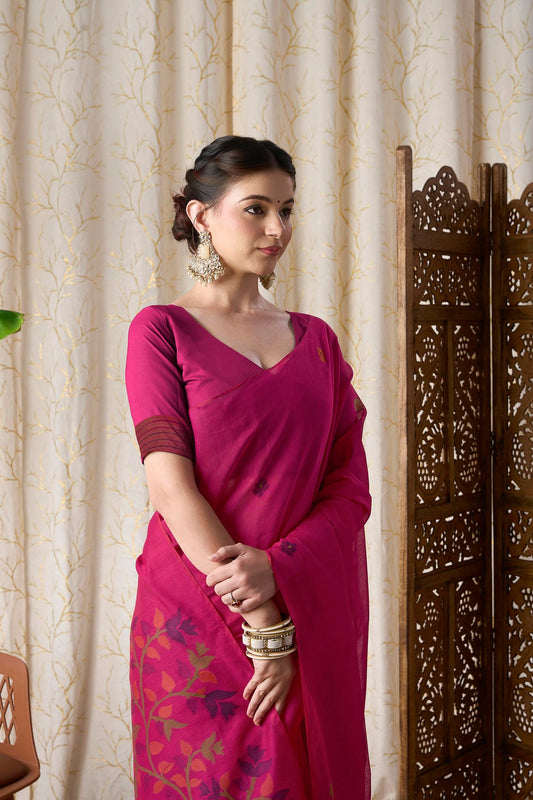 Rani Pink Muga-Cotton Jamdani Saree with Woven Floral Motifs
