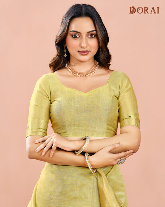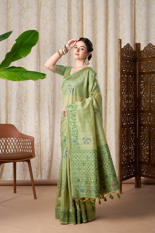 Dhakai Jamdani Light Pistachio Green Muga Tissue Cotton Saree – Woven Paisley Pallu