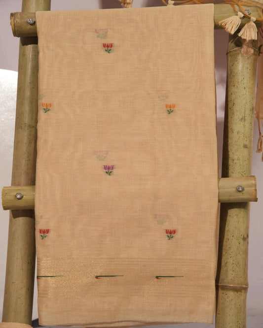 Sandy Beige and Multicolored Muga Cotton Unstitched Suit Set