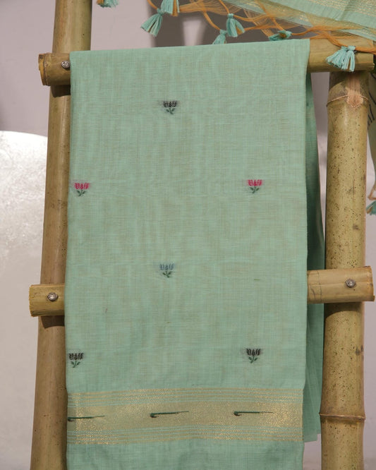 Sea Green and Golden Muga Cotton Unstitched Suit Set