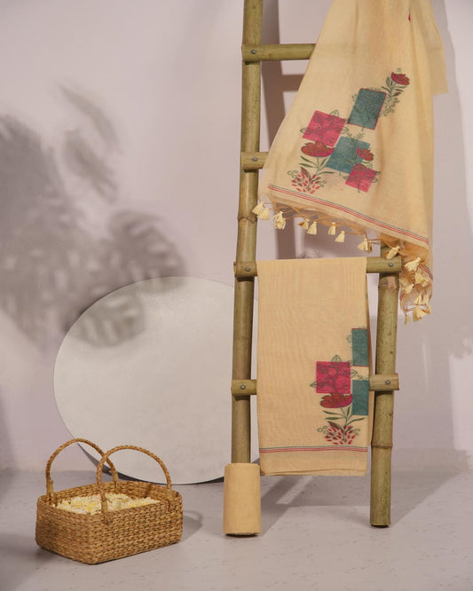 Cream and Multicolored Muga Cotton Unstitched Suit Set