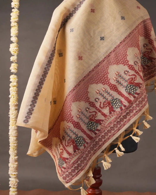 Light Peach Muga Cotton Unstitched Suit Material with Elephant Motif Dupatta