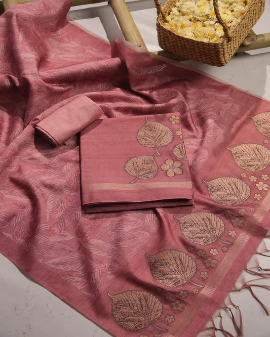 Dusty Rose Leaf Motif Semi Tussar Silk Unstitched Suit Material with Zari Border