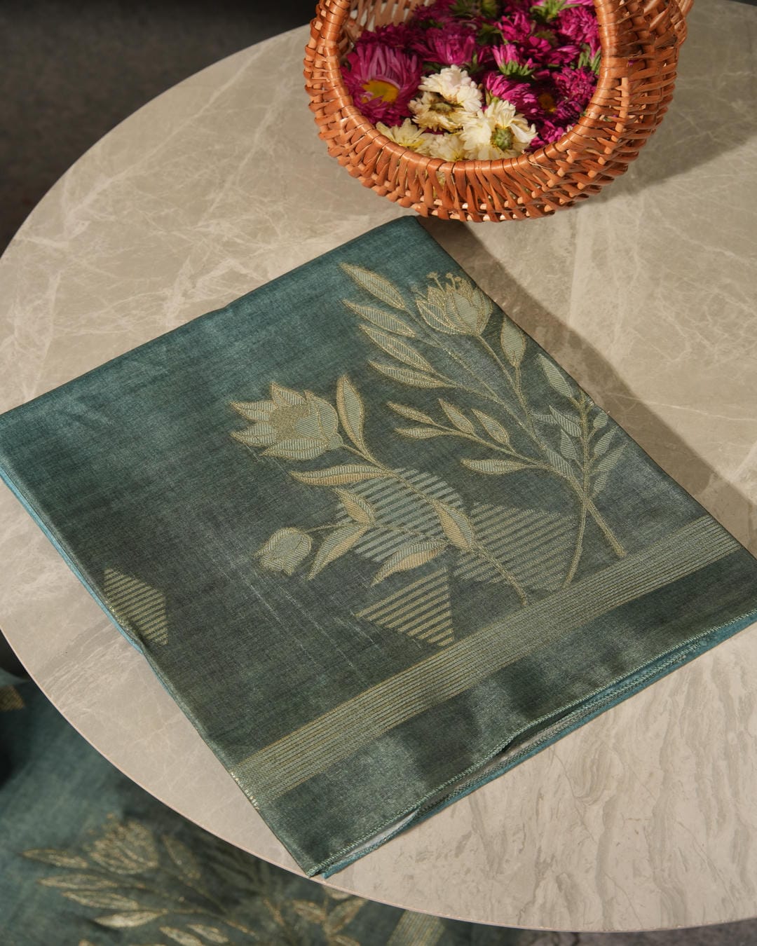 Immerse yourself in the warm, autumnal glow of this Burnt Orange Jamdani Unstitched Suit Set, a stunning example of the Bengal weave reimagined in Semi Tussar Silk. The fabric boasts a rich, dual-tone texture that catches the light beautifully, providing a subtle shimmer perfect for grand occasions. The kurta fabric is adorned with intricate golden woven motifs of blossoming flowers and elongated leaves, while the dupatta features a modern interplay of striped geometric patterns. This ensemble offers a structured silhouette and a luxurious feel, making it a standout choice for weddings, festivals, or high-end ethnic gatherings where you want to radiate elegance and warmth.