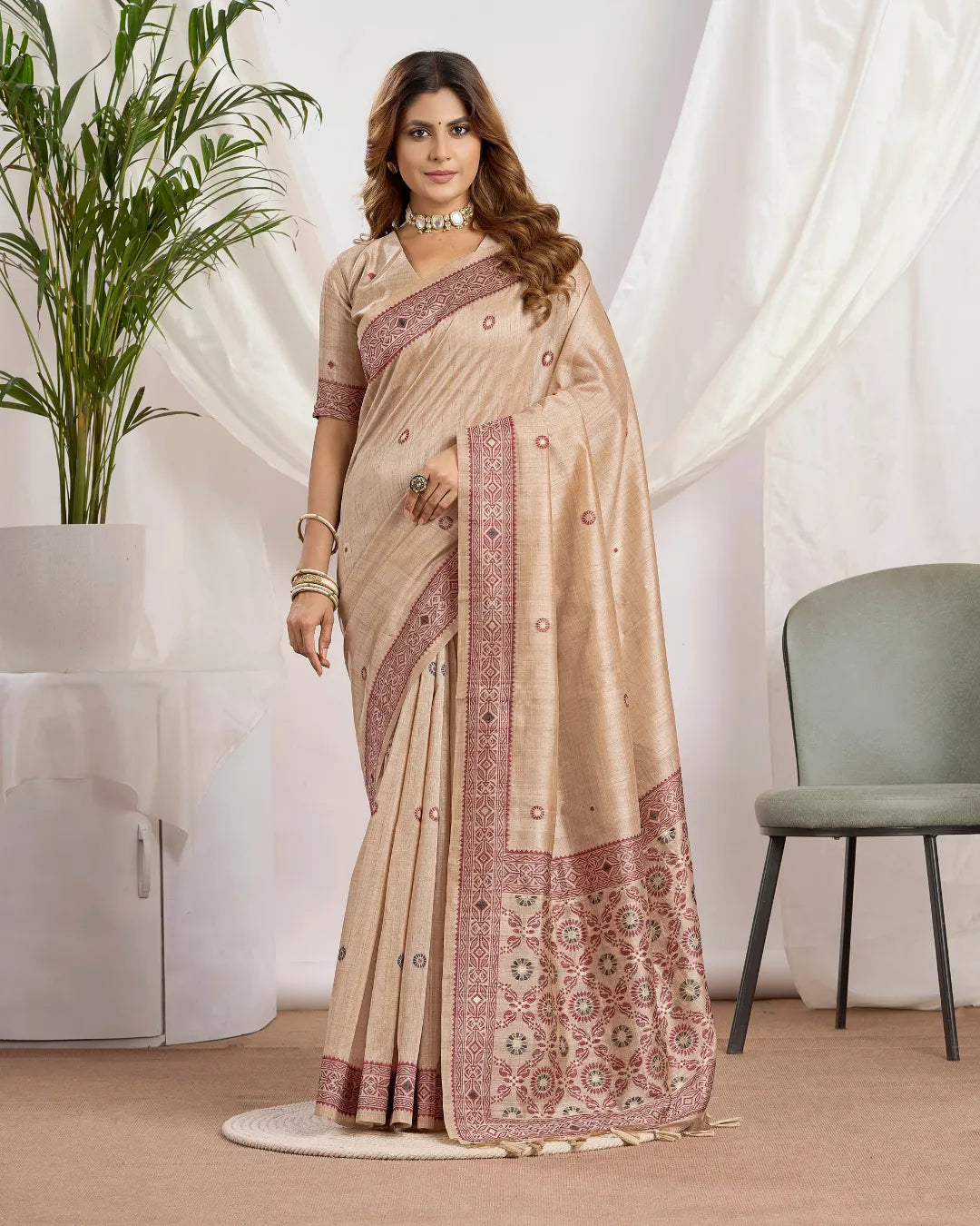 Saree Fabric: Pure Tassar Silk (Rich Texture & Natural Sheen)