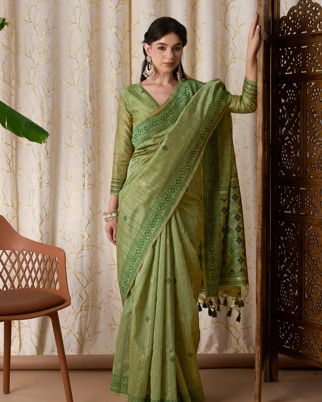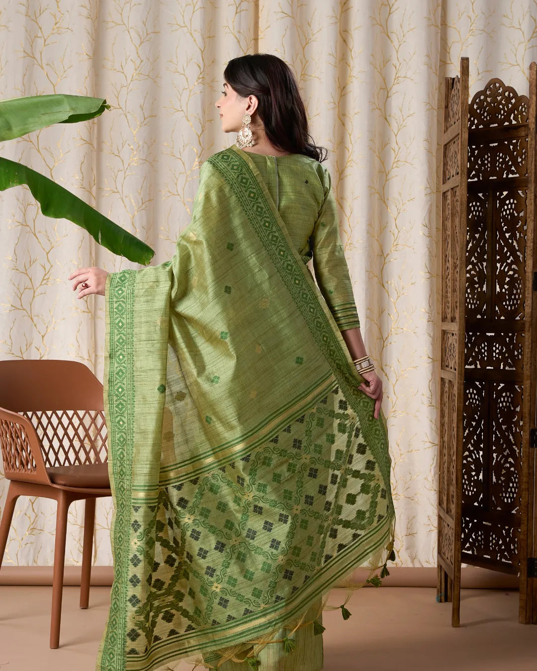 Dark Pista Tassar Silk Saree with Jamdani Resham Border