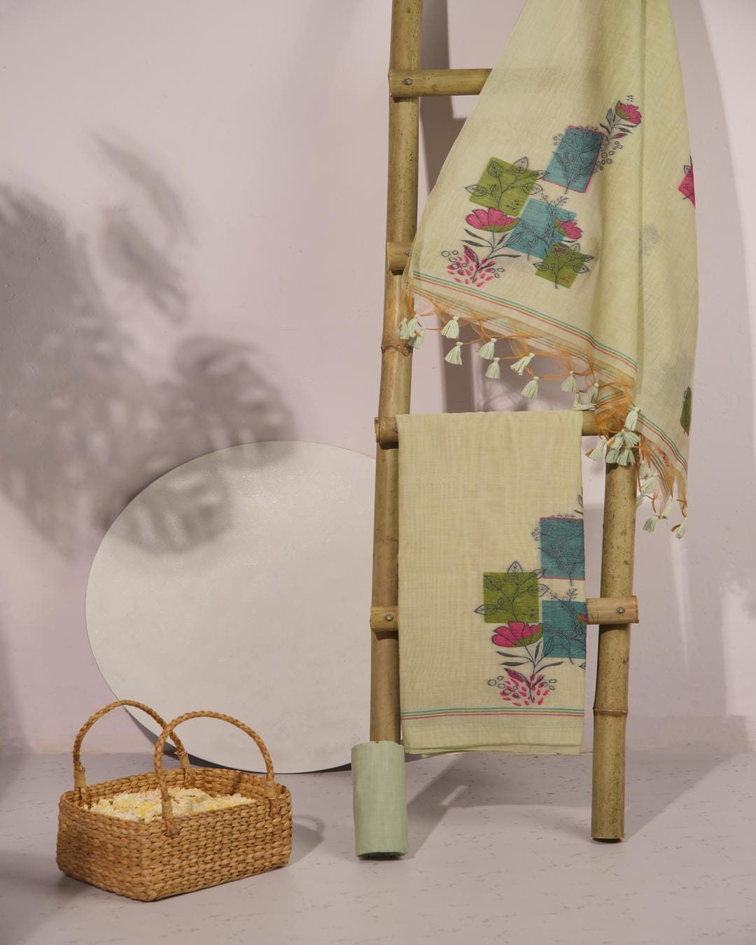 Embrace the charm of traditional craftsmanship with this Lime Green and Teal Muga Cotton Unstitched Suit Set. This ensemble is a beautiful tribute to heritage weaving, featuring a refreshing lime green base that exudes understated luxury.