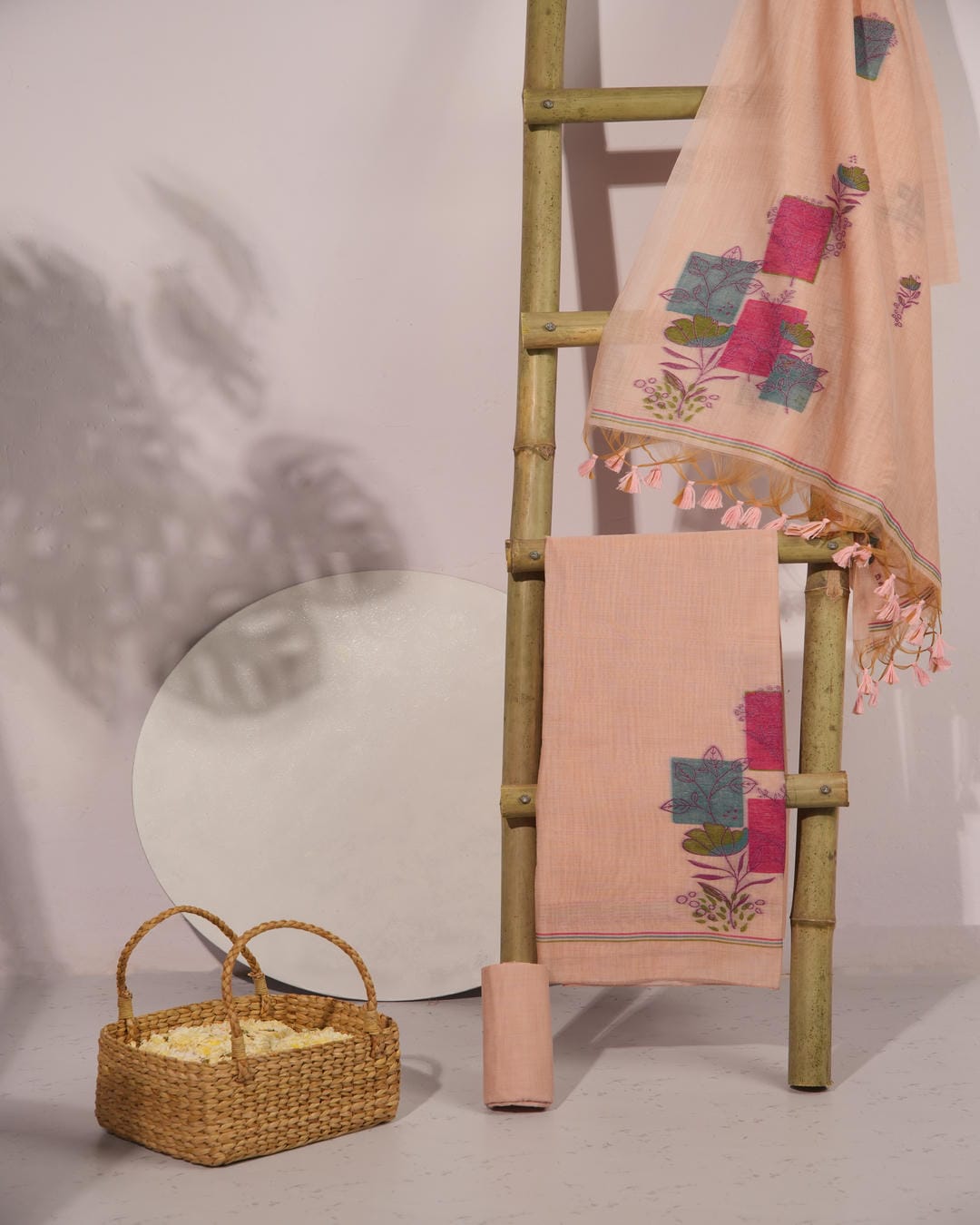 Embrace the charm of traditional craftsmanship with this Peach and Teal Muga Cotton Unstitched Suit Set. This ensemble is a beautiful tribute to heritage weaving, featuring a soft peach base that exudes understated luxury.