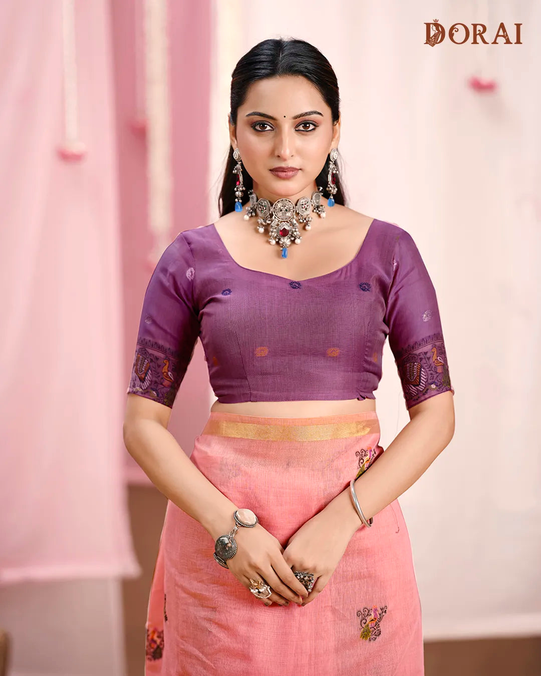 Blush Romance – Pink Muga Cotton Saree with Heritage Artistry
