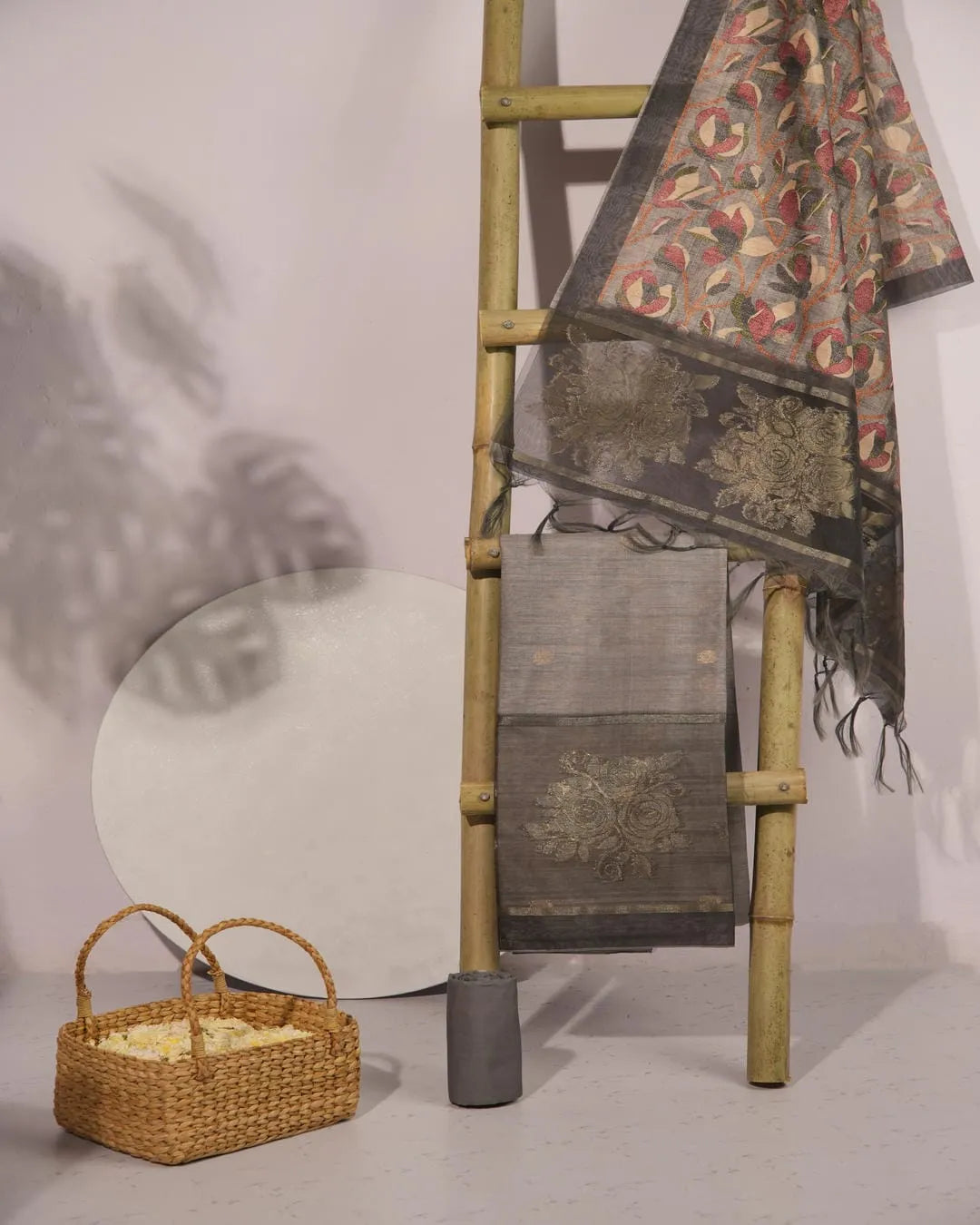 Steel Grey Muga Cotton Suit for Formal Wear Dorai