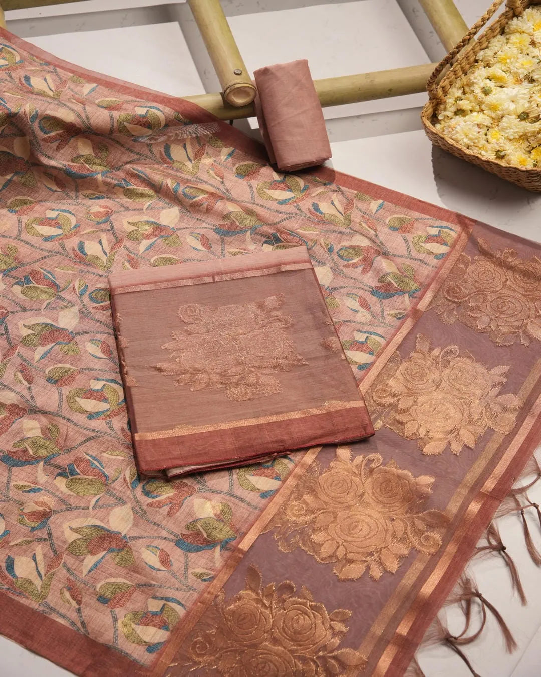 Copper Muga Cotton Unstitched Suit Material with Elephant Motif Dupatta