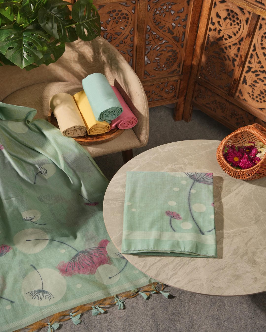 Refresh your ethnic wardrobe with the breezy charm of this Soft Mint Green Muga Cotton Unstitched Suit Set. Crafted from premium Muga Cotton, this ensemble offers a lightweight and breathable texture, making it perfect for long-lasting comfort. The fabric features an artistic display of stylized pink floral motifs and abstract white orbs, creating a modern yet earthy aesthetic. The look is beautifully finished with a contrasting mustard yellow border adorned with playful tassels, making it an ideal choice for office wear, casual brunches, or daytime social gatherings.