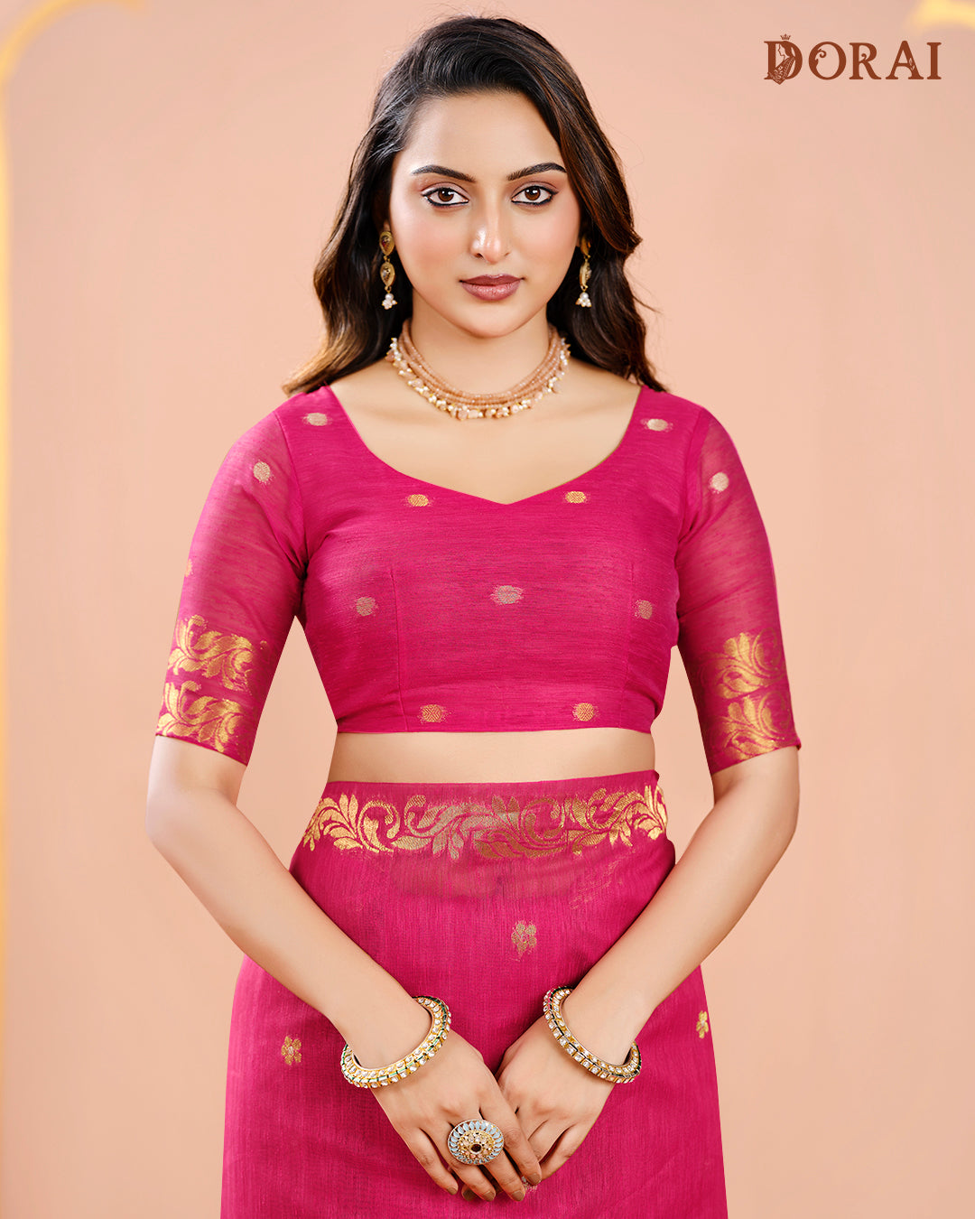 Embrace the sophisticated drama of this Solid Pink Jamdani saree, perfectly blending tradition with modern elegance. Woven from a breathable Jute Linen-Cotton blend, this saree offers a crisp drape with a subtle, comfortable texture. The deep, rich color is dramatically contrasted by the intricate golden zari work, which features bold, stylized floral buttas and vines densely patterned across the lower border and pallu. The pallu is further adorned with simple tassels, adding a charming finish. The matching blouse completes this striking ensemble, making it ideal for evening events, festive gatherings, or high-end office wear where traditional style is appreciated.