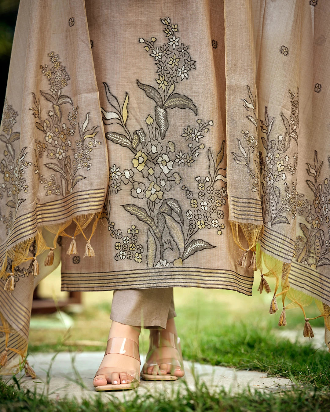 Dupatta Fabric: Muga Cotton with Elaborate Botanical Border and Tassels
