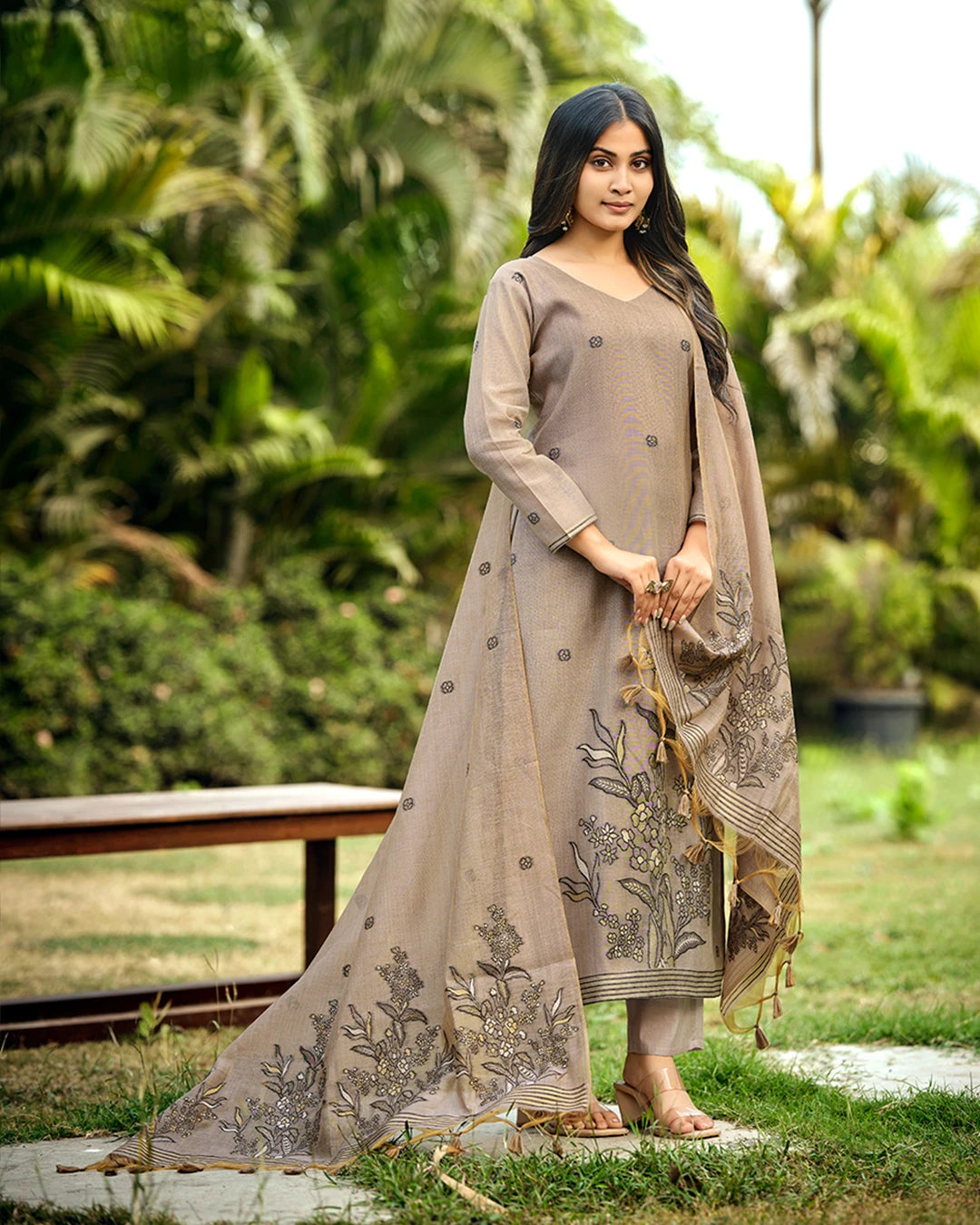 Woven from premium Muga cotton, a fabric celebrated for its natural golden sheen and exceptional durability, this suit set provides a crisp yet lightweight drape perfect for all-day wear. The breathable nature of the handloom fabric ensures you stay comfortable from morning meetings to evening gatherings. Our original photography captures every fine botanical detail and the true depth of the steel grey shade, ensuring the artisanal quality you see is exactly what you receive.